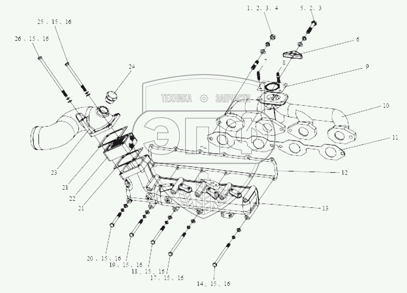 Каталог запасных частей к технике: FAW CA4DF3-13E3. Впускные и выпускные газопроводы