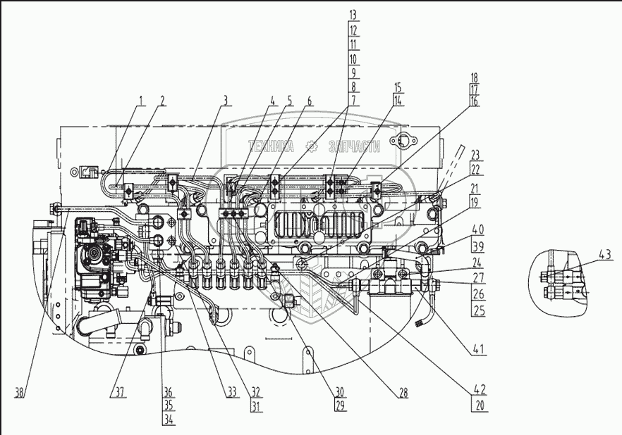 | 42 | D26C-018-900 | Fuel return pipe assy, fuel injection pump | Нет на складе | |