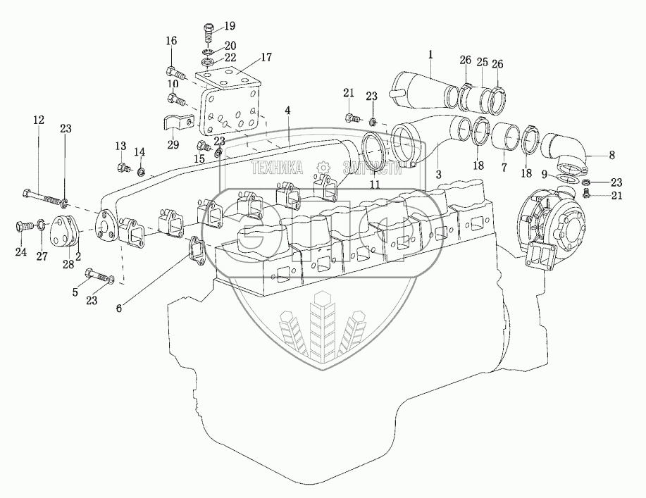 Каталог запасных частей к технике: Weichai WD615 (Евро 3). Впускная и выхлопная трубы