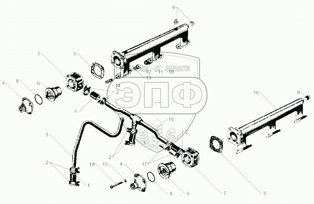 Каталог запасных частей к технике: ЯМЗ-238М2. Трубопроводы и термостаты системы охлаждения