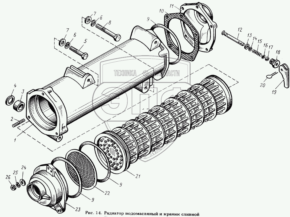 Каталог запасных частей к технике: ЯМЗ-8423.10. Радиатор водомасляный и краник