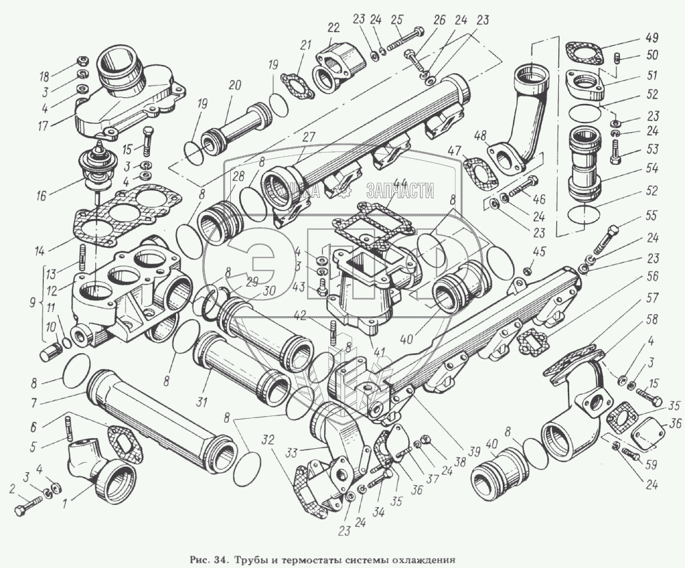 Каталог запасных частей к технике: ЯМЗ-8423.10. Трубы и термостаты системы охлаждения