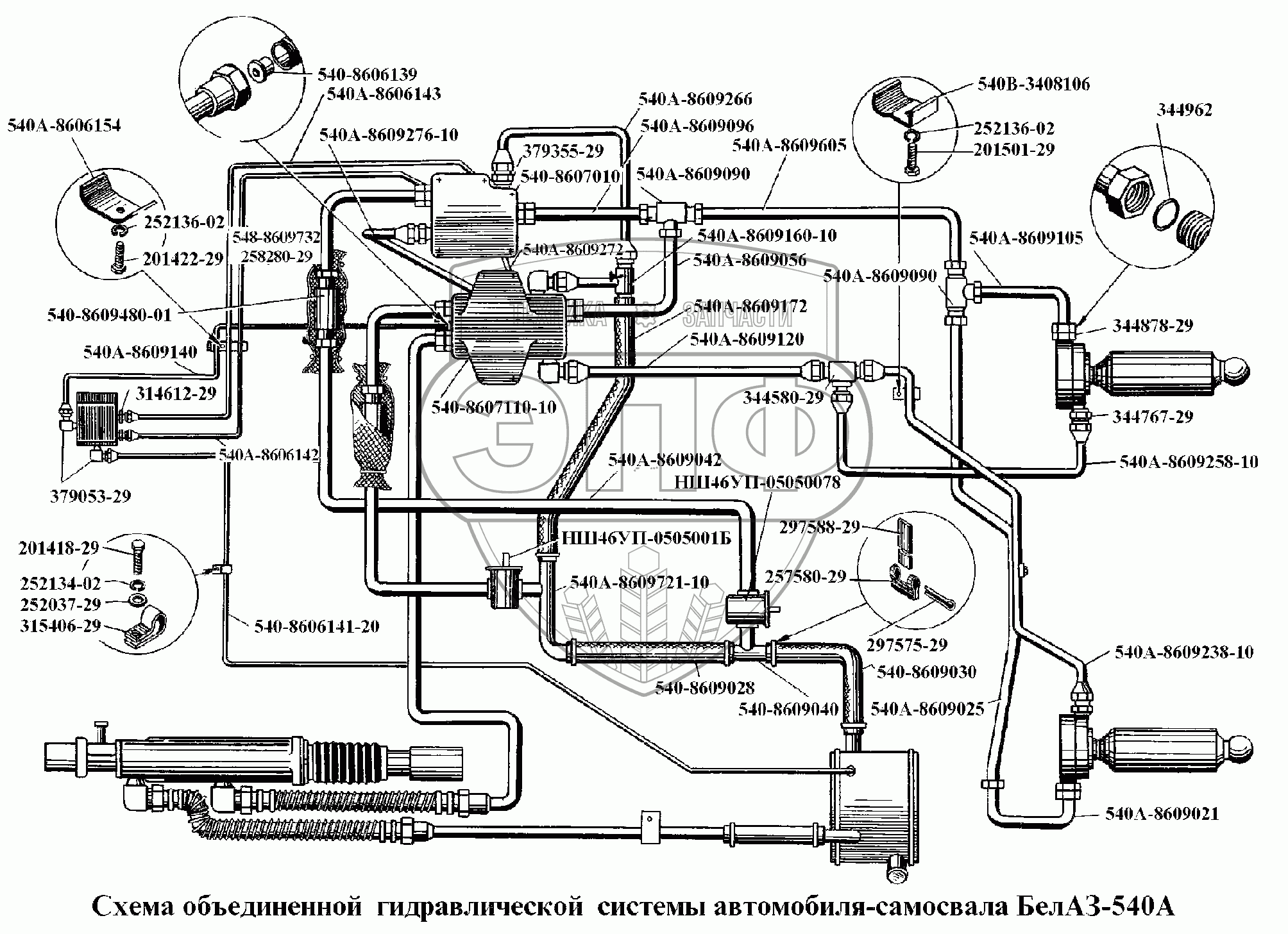Каталог запасных частей к технике: БелАЗ-540А. Схема объединенной гидравлической системы