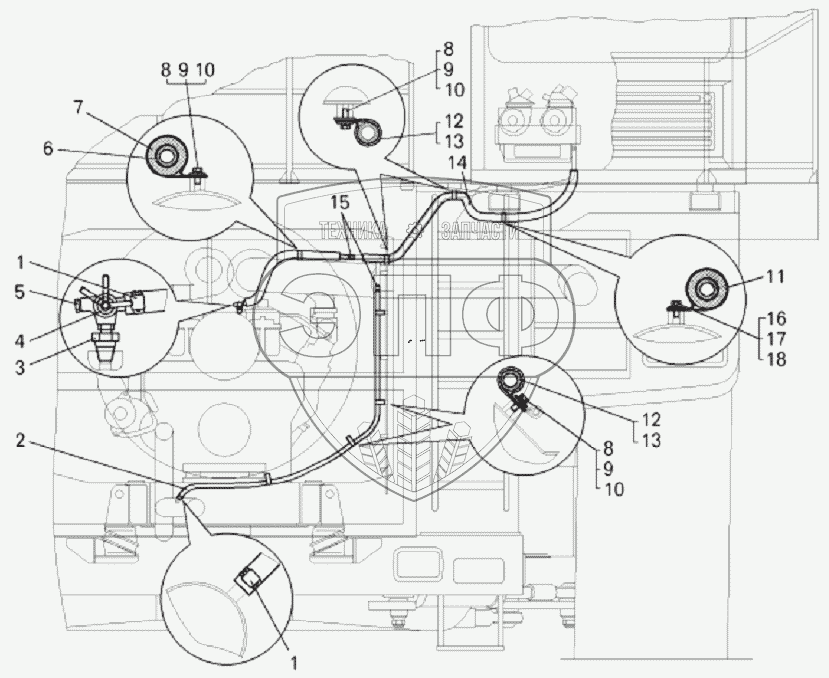 Каталог запасных частей к технике: БелАЗ-75131. Установка трубопроводов отопителя кабины