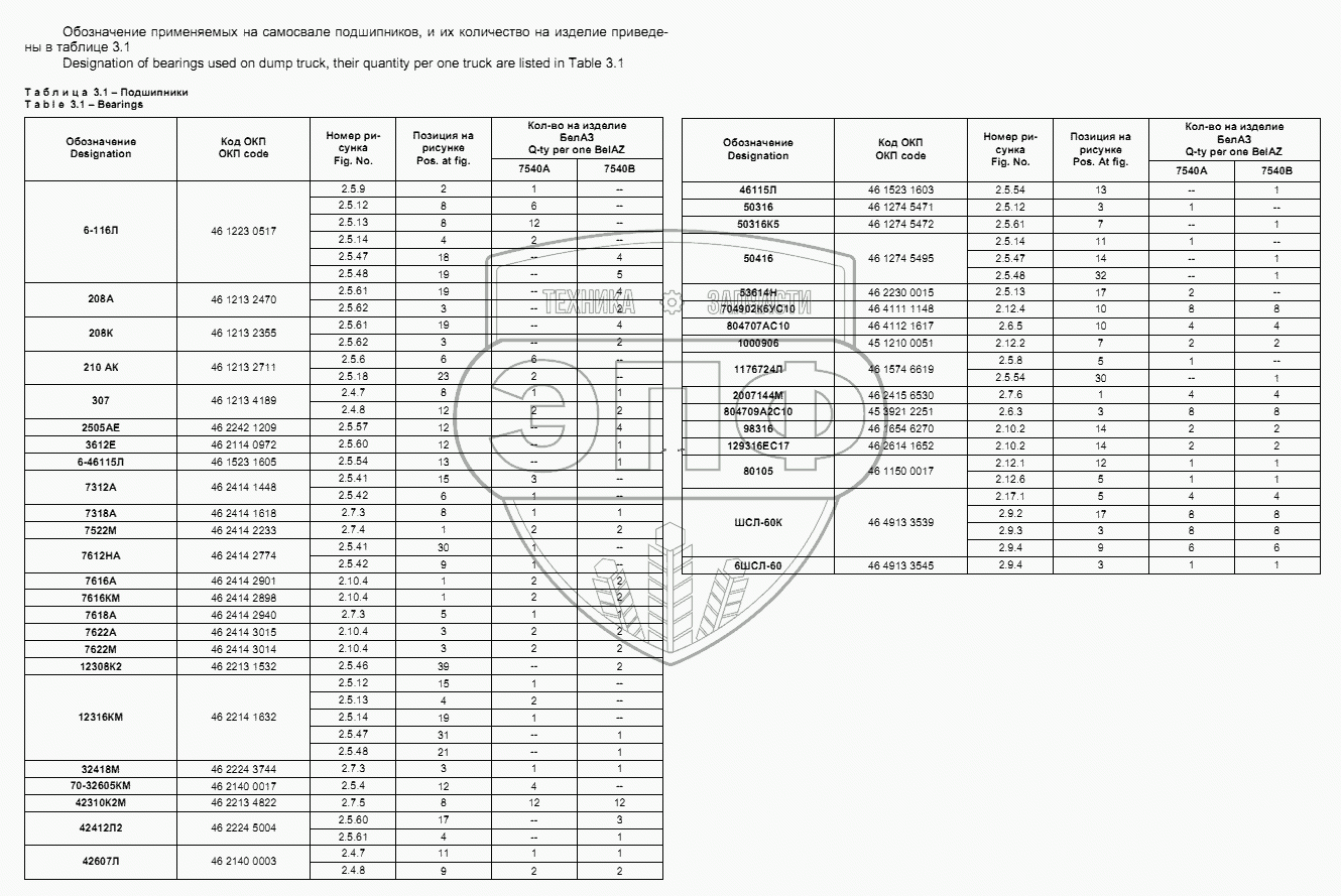 Каталог запасных частей к технике: БелАЗ-7540D. Подшипники