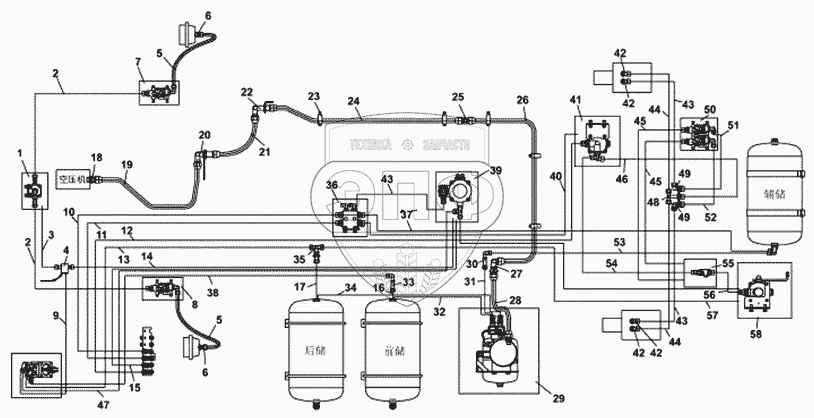Каталог запасных частей к технике: DongFeng DFL-4181A. Распределительная схема трубопровода пневмотормоза