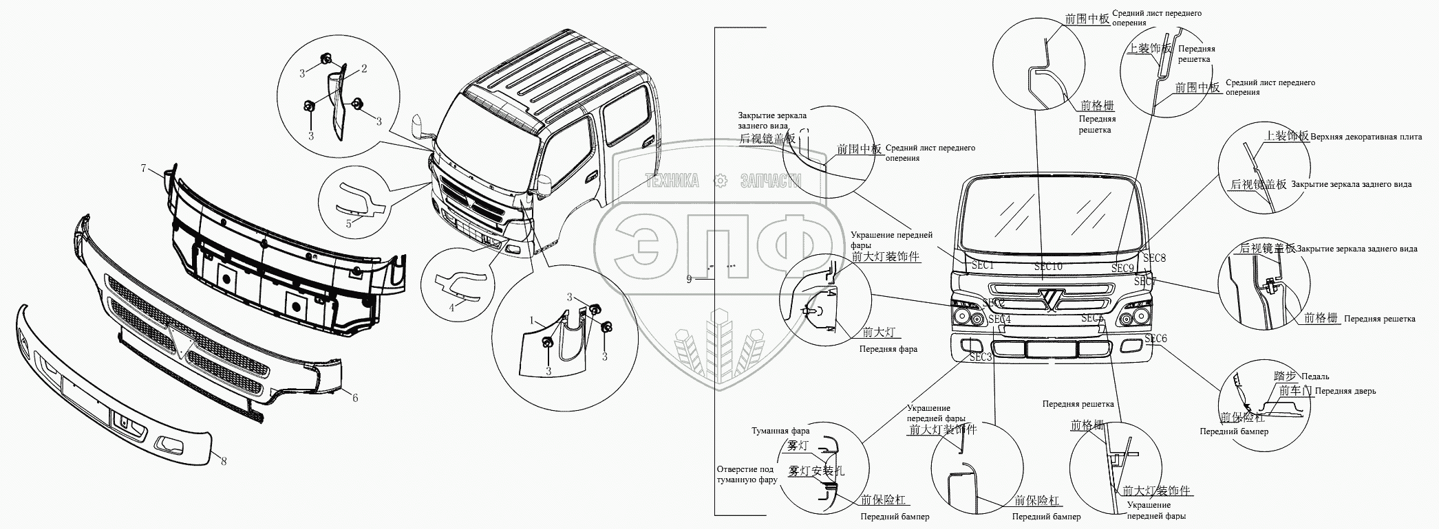 Каталог запасных частей к технике: Foton BJ1051, BJ1061 (Aumark). 1SB2005310106 Принадлежности переднего оперения
