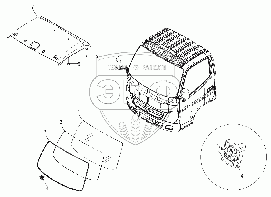 Каталог запасных частей к технике: Foton-BJ1069. Ветровое стекло и аксессуары крыши