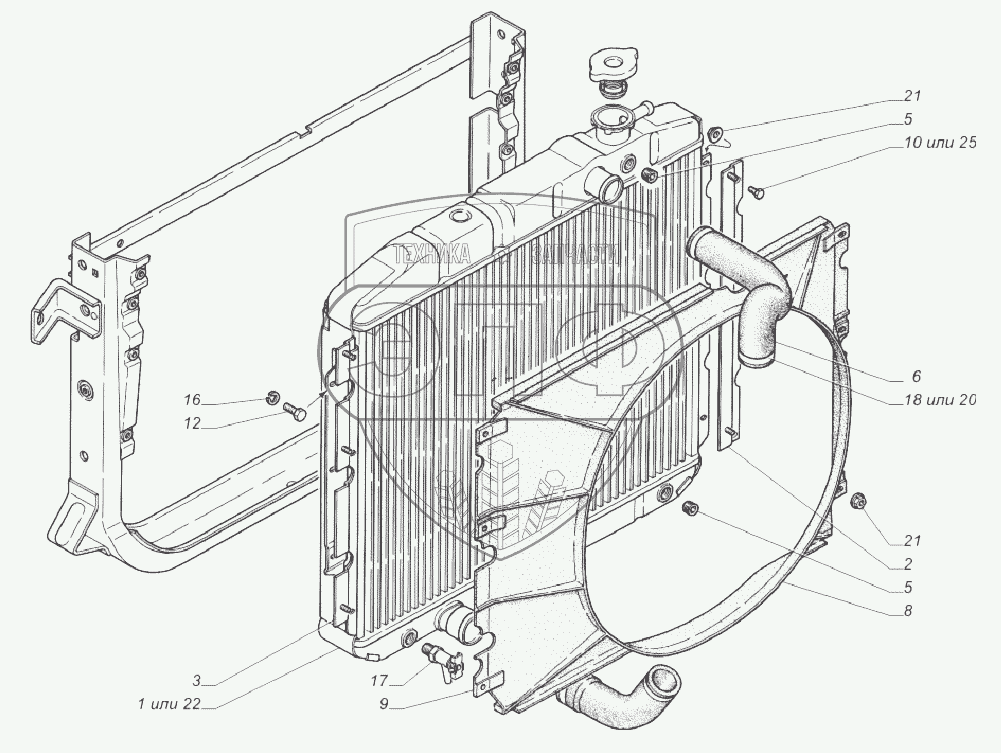 Каталог запасных частей к технике: ГАЗ-33081. 33081-1301003. Установка радиатора