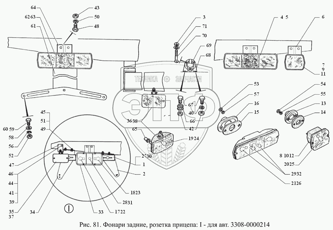 Каталог запасных частей к технике: ГАЗ-3308. Фонари задние, розетка прицепа