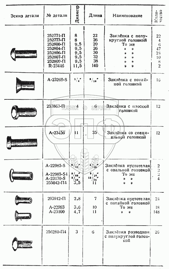 Каталог запасных частей к технике: ГАЗ-ММ "Полуторка". Заклепки