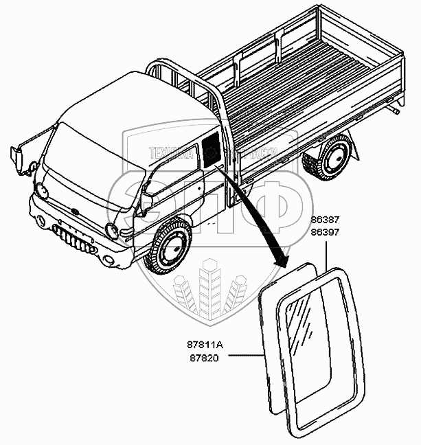 Каталог запасных частей к технике: Hyundai H100 Porter. Стекло боковое