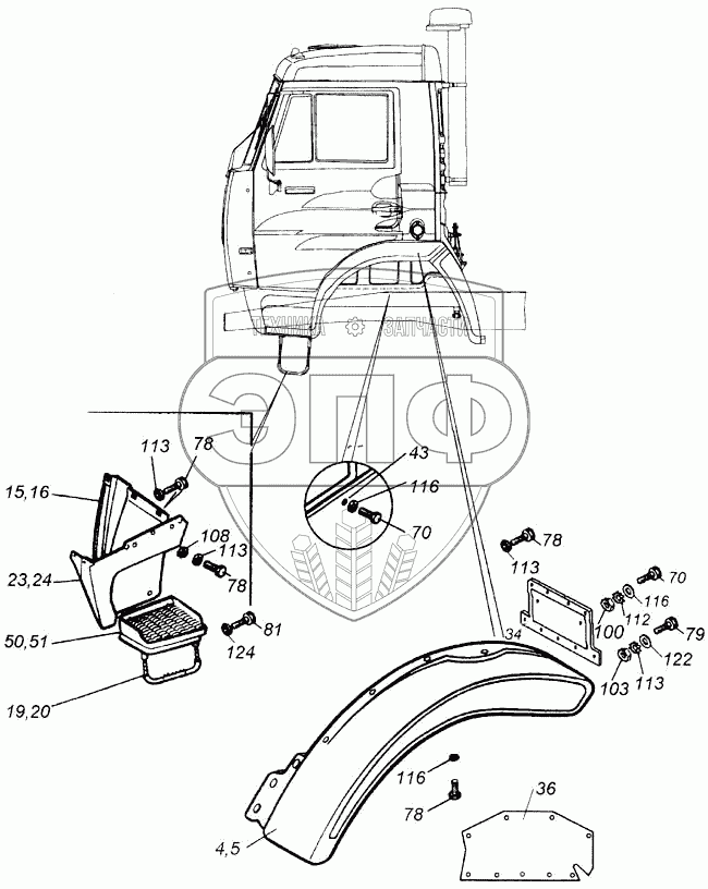 Каталог запасных частей к технике: Камский автозавод 43114. Установка оперения кабины