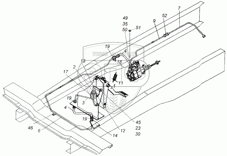 Каталог запасных частей к технике: Камский автозавод 43118. Установка педали и привода выключения