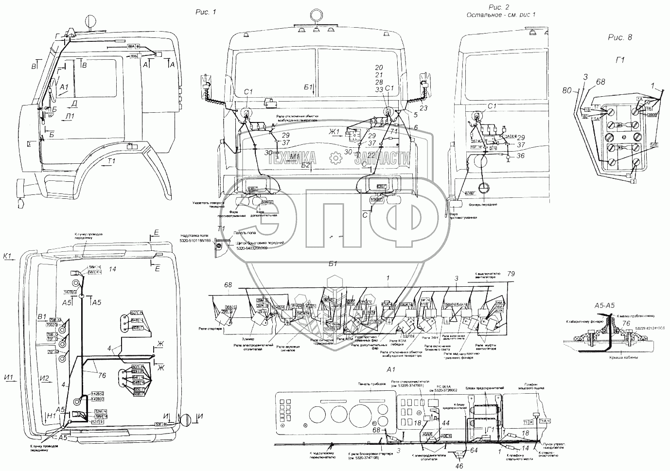 Каталог запасных частей к технике: Камский автозавод 43118. Установка проводов на кабине