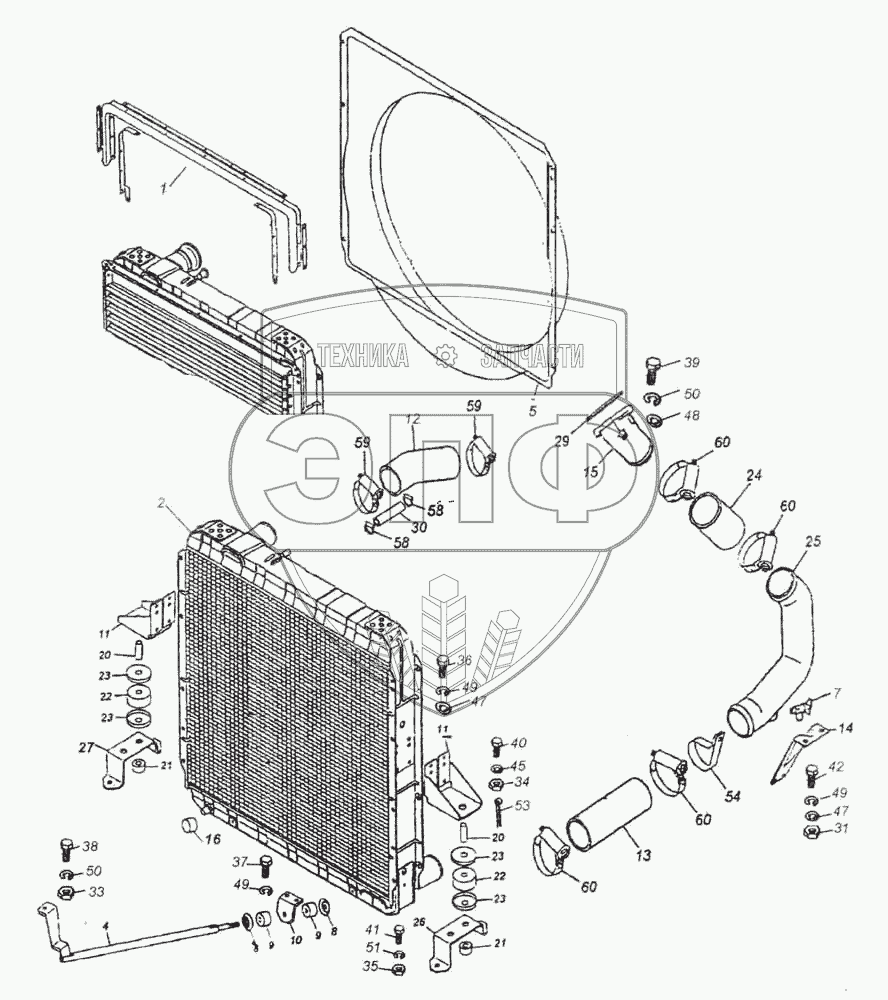 Каталог запасных частей к технике: Камский автозавод 53228, 65111. Установка радиатора