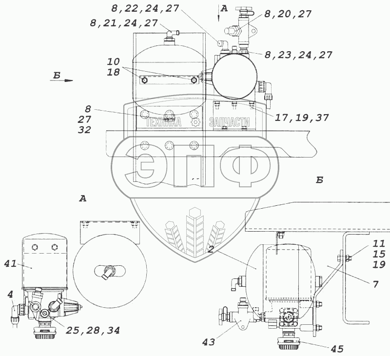 Каталог запасных частей к технике: Камский автозавод 5360. Установка осушителя