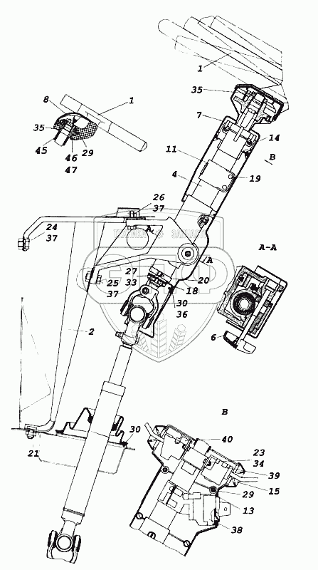 Каталог запасных частей к технике: Камский автозавод 5460. Установка колонки рулевого управления