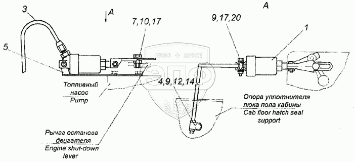 Каталог запасных частей к технике: Камский автозавод 6460. Установка цилиндра выключения подачи топлива