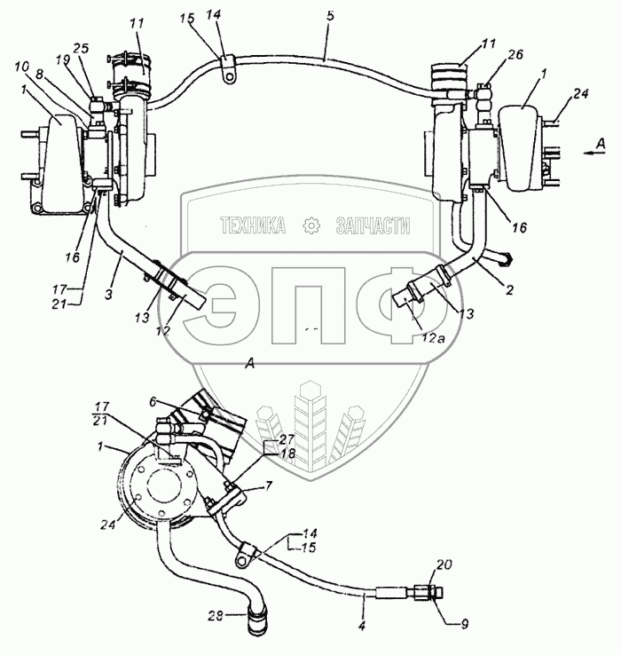 Каталог запасных частей к технике: Камский автозавод 6460. Установка турбокомпрессора