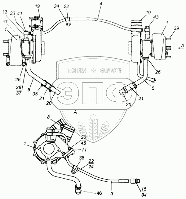 Каталог запасных частей к технике: Камский автозавод 65115. Установка турбокомпрессора