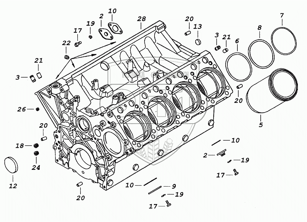 Каталог запасных частей к технике: Камский автозавод 65116. Блок цилиндров в сборе
