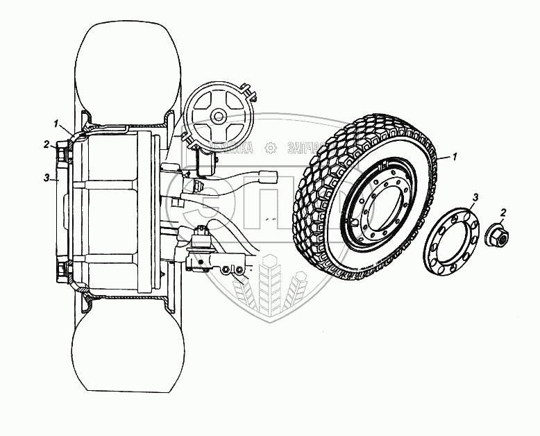 Каталог запасных частей к технике: Камский автозавод 65116. Установка передних стальных колес