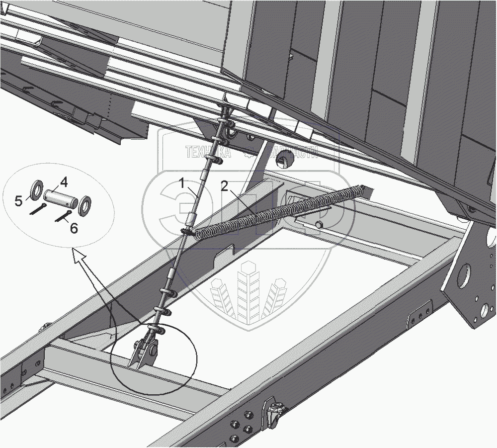 Каталог запасных частей к технике: Камский автозавод 65201. Установка троса ограничителя платформы