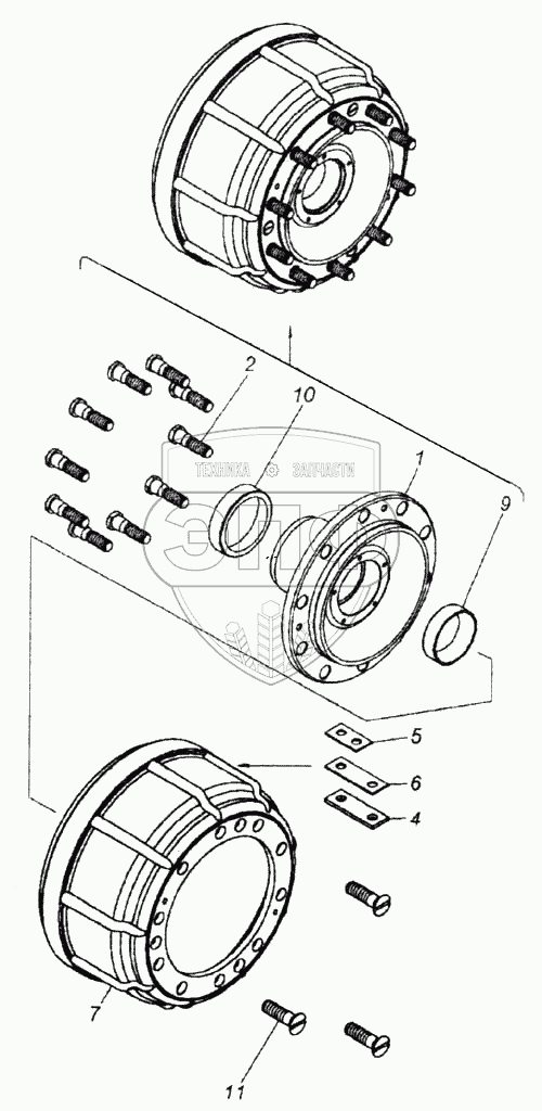 Каталог запасных частей к технике: Камский автозавод 6520. Ступица с тормозным барабаном