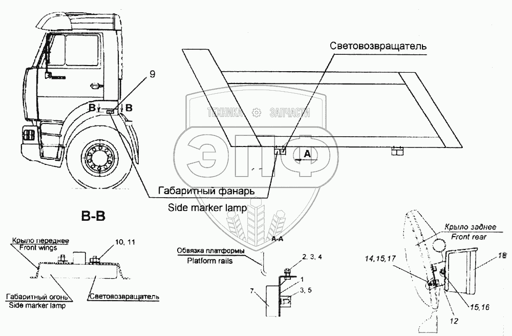 Каталог запасных частей к технике: Камский автозавод 6520. Установка боковых габаритных фонарей