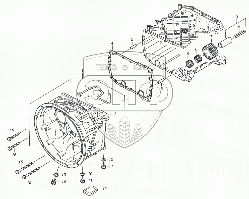 Каталог запасных частей к технике: Камский автозавод 6520. Установка картера сцепления