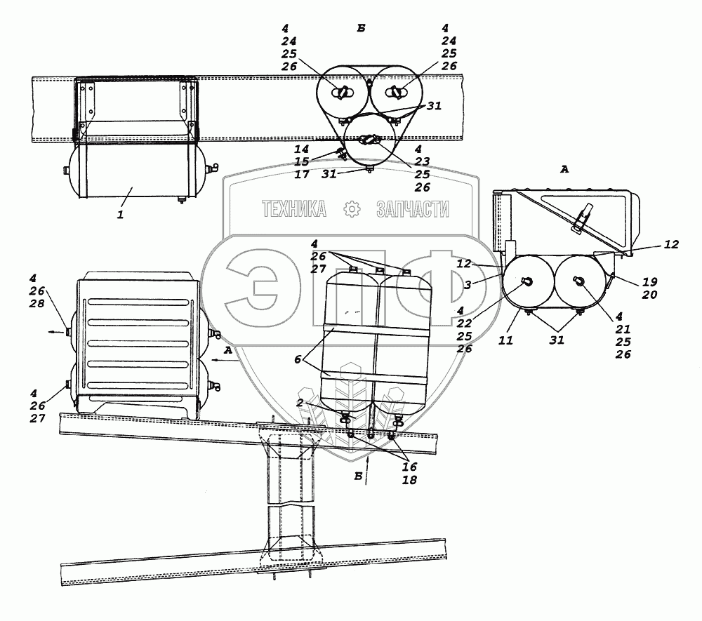 Каталог запасных частей к технике: Камский автозавод 65226. Установка воздушных ресиверов