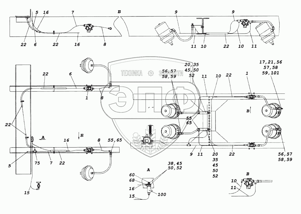 Каталог запасных частей к технике: Камский автозавод 6522. Установка пневмоуправления системой АБС