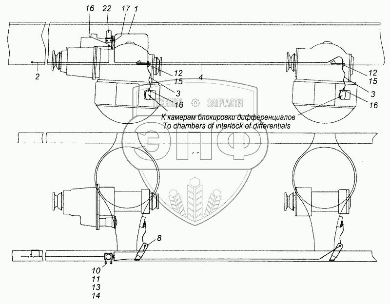 Каталог запасных частей к технике: Камский автозавод 6540. Привод блокировки межколесных дифференциалов