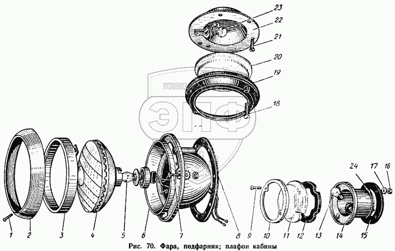 Каталог запасных частей к технике: КАЗ 608. Фара, подфарник, плафон кабины