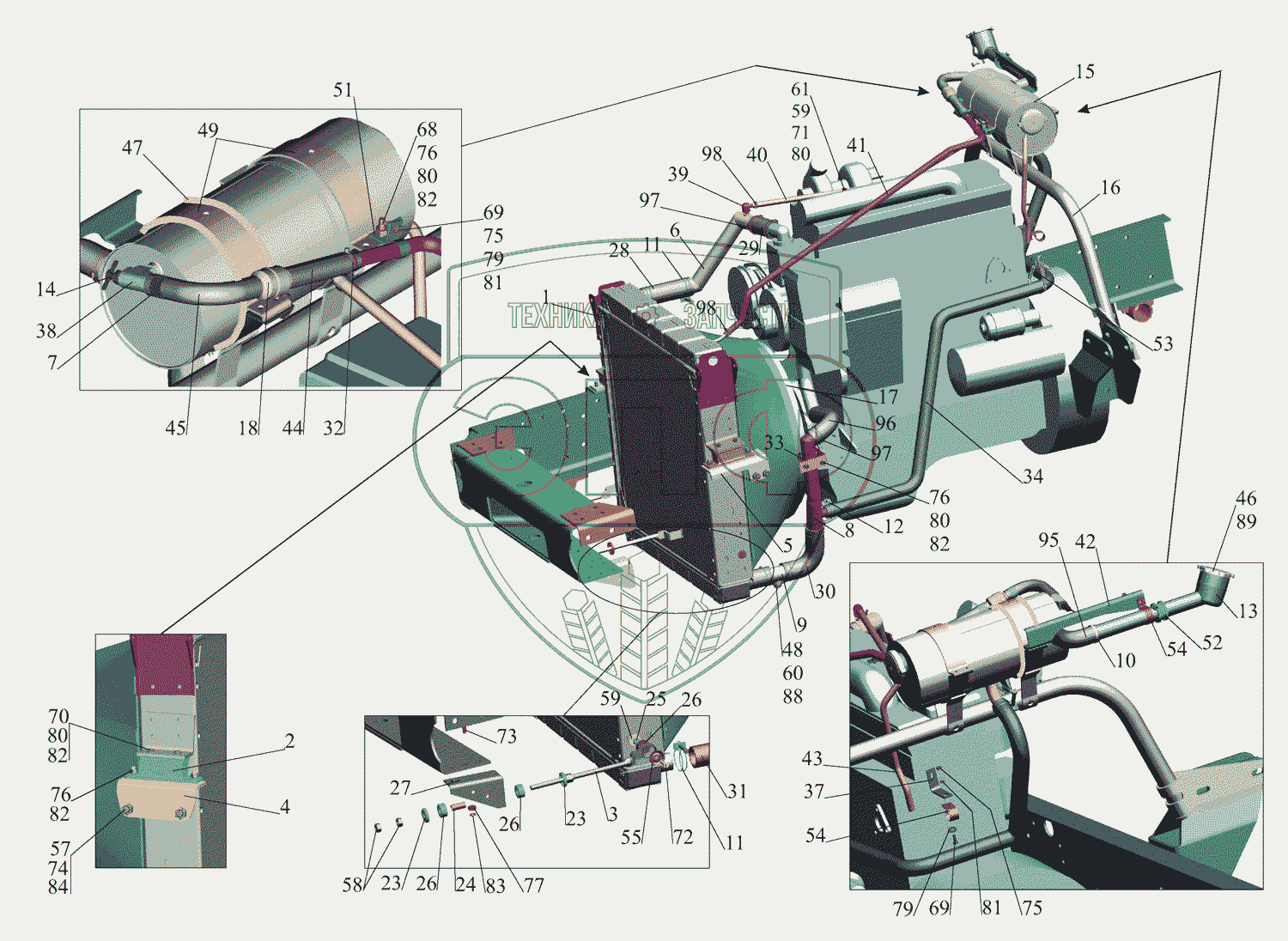 Каталог запасных частей к технике: МАЗ-437040 (Зубренок). Установка системы охлаждения