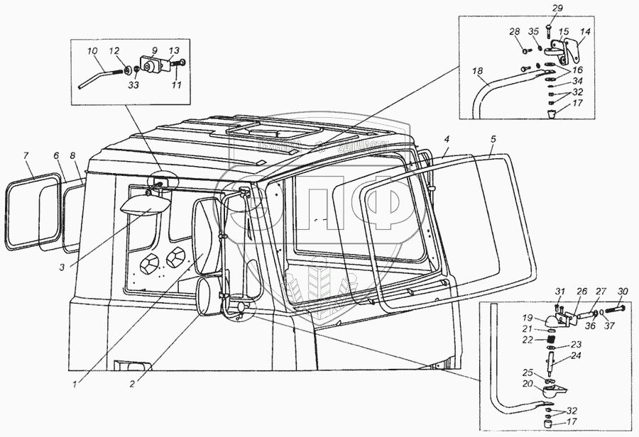 Каталог запасных частей к технике: МАЗ-437040 (Зубренок). Установка стекол и зеркал