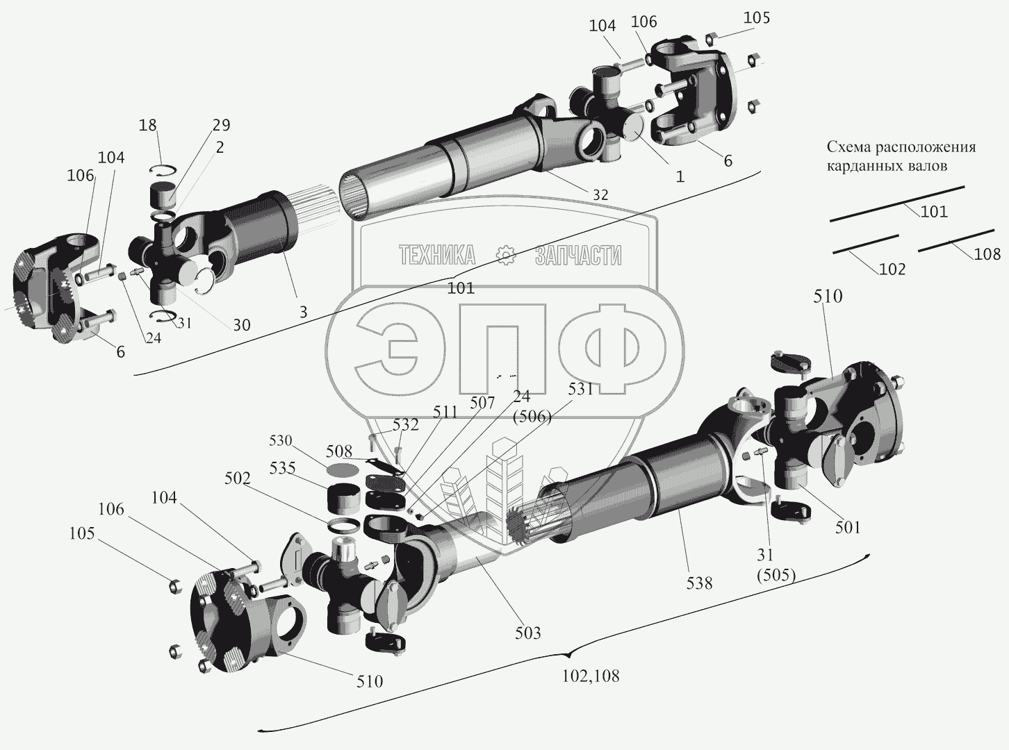 Каталог запасных частей к технике: МАЗ-530905. Установка карданных валов