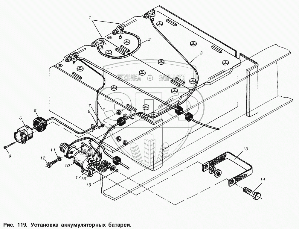 Каталог запасных частей к технике: МАЗ-53366. Установка аккумуляторной батареи