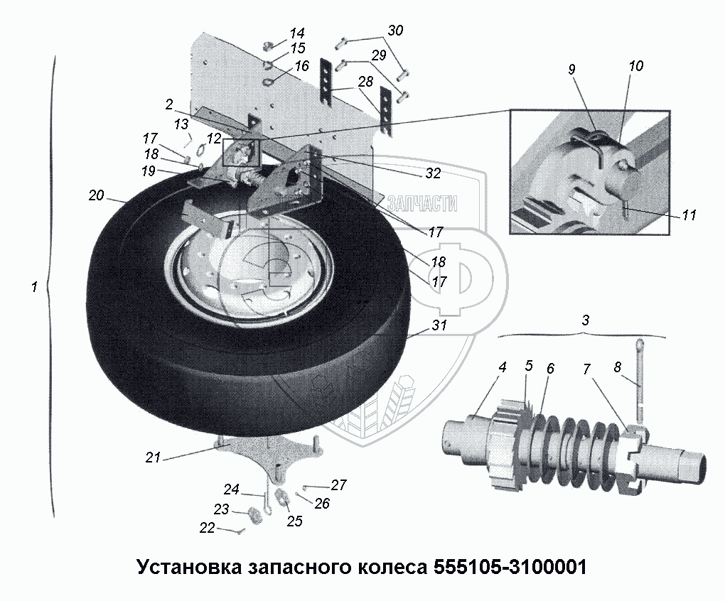 Каталог запасных частей к технике: МАЗ-533731. Установка запасного колеса 555105-3100001