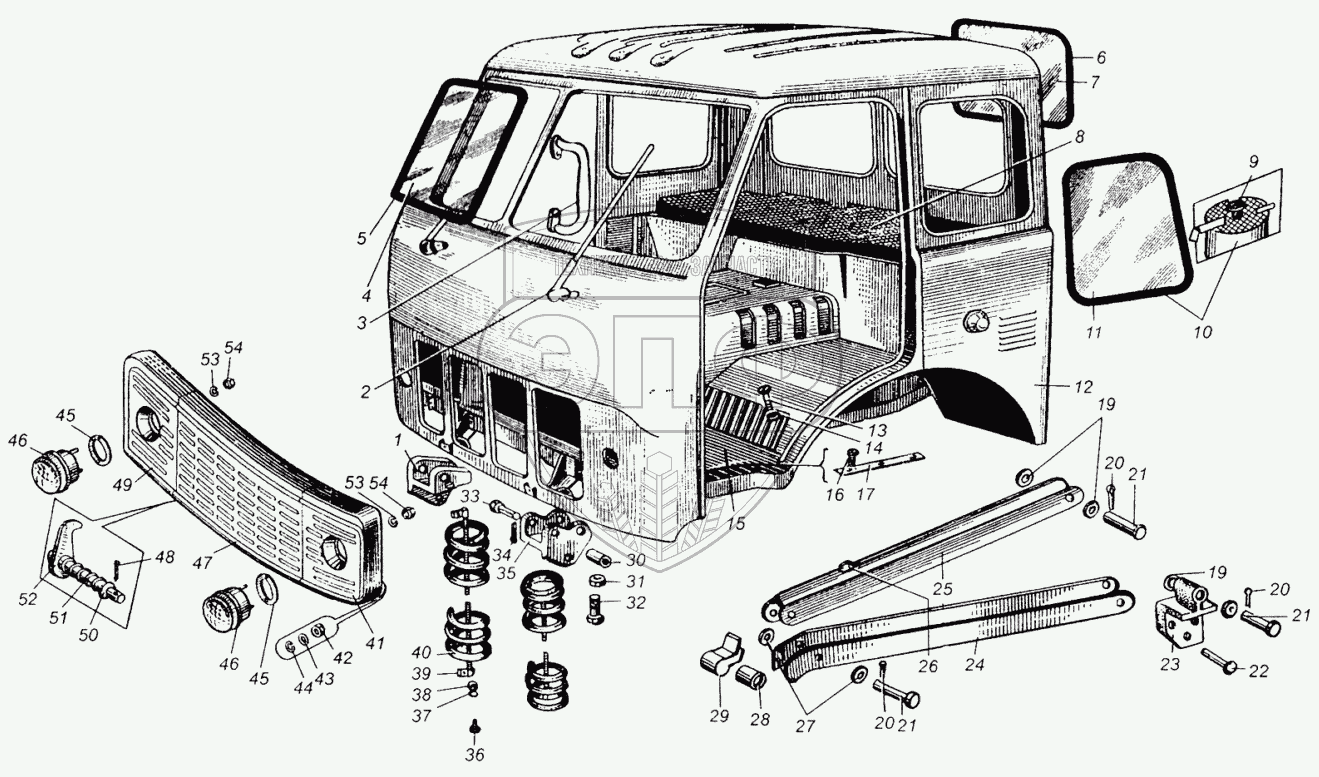 Каталог запасных частей к технике: МАЗ-5429. Каркас кабины и его крепление