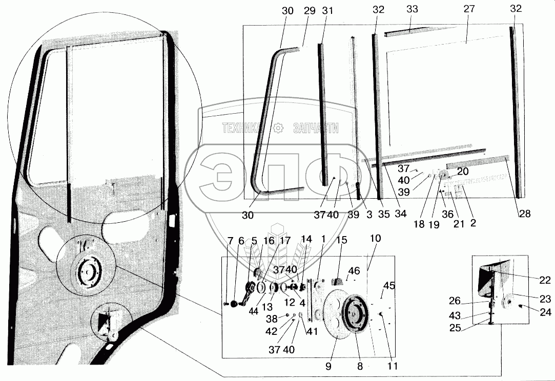 Каталог запасных частей к технике: МАЗ-543202. Установка стеклоподъемника и ручки стеклоподъемника