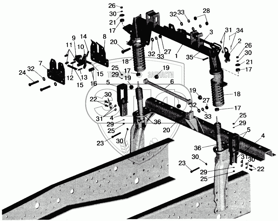 Каталог запасных частей к технике: МАЗ-543202. Заднее подрессоривание большой кабины
