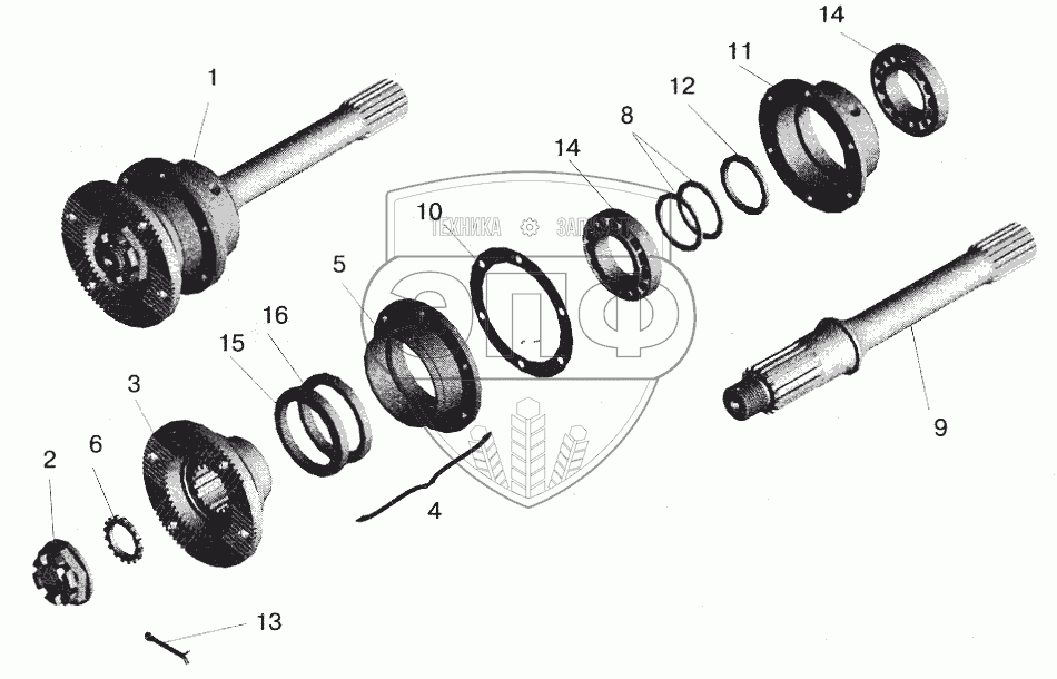 Каталог запасных частей к технике: МАЗ-5432. Мост средний. Вал задний