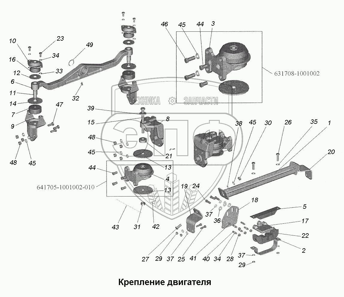 Каталог запасных частей к технике: МАЗ-543403, 641705, 641708. Крепление двигателя