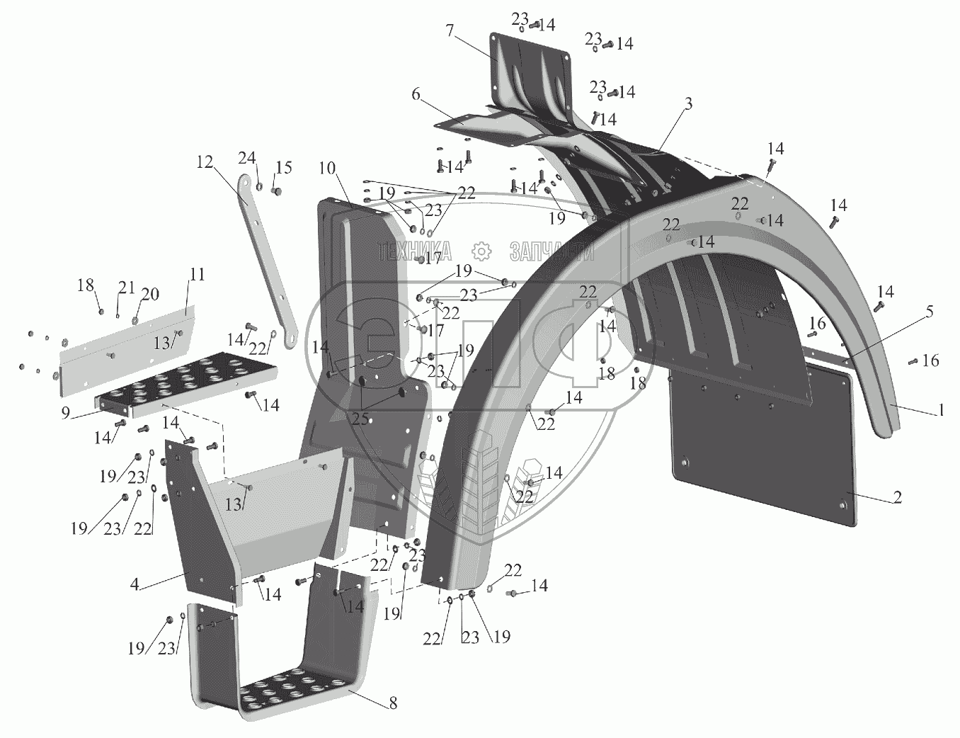 Каталог запасных частей к технике: МАЗ-551605. Установка оперения на малую кабину