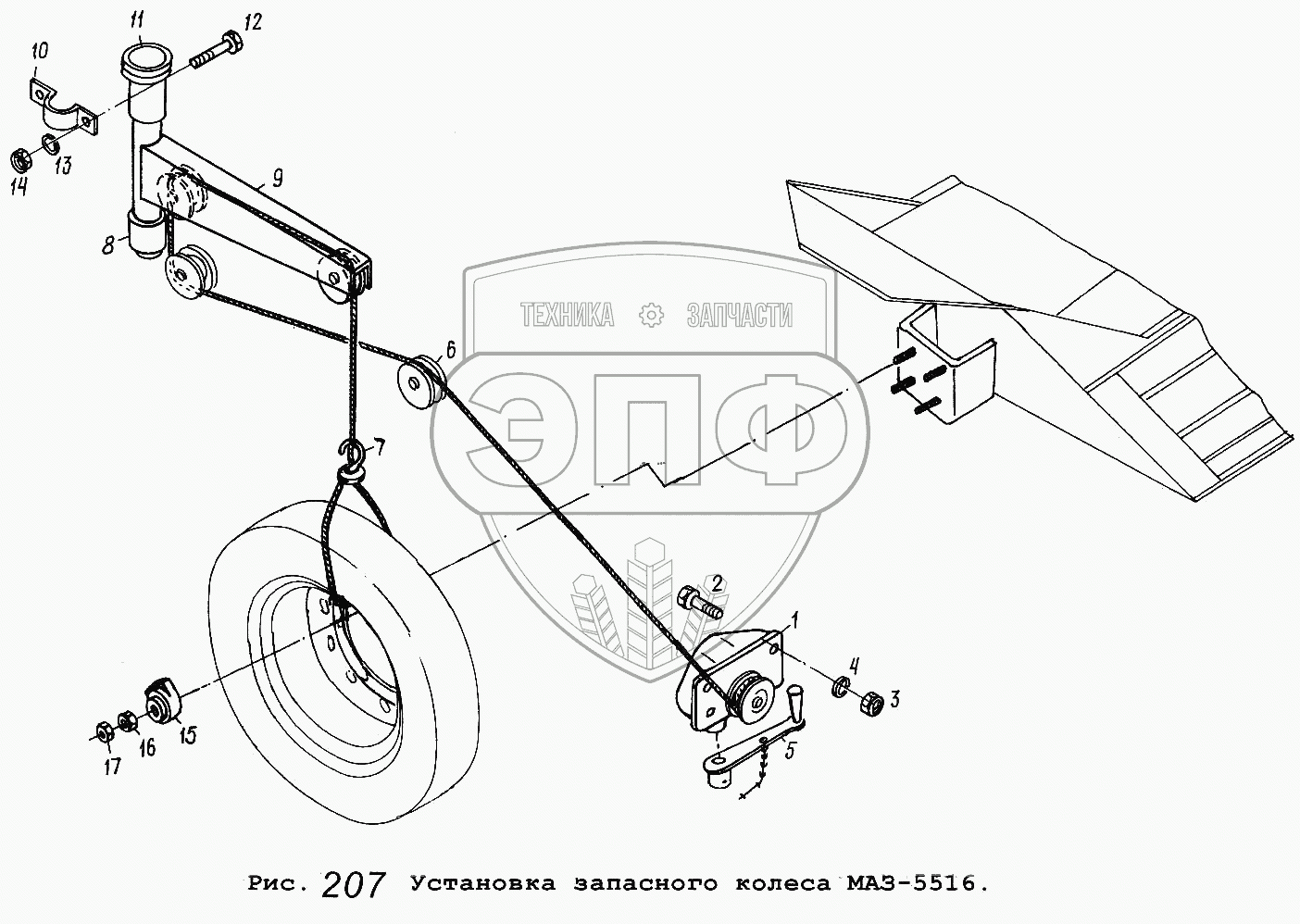 Каталог запасных частей к технике: МАЗ-5516. Установка запасного колеса МАЗ-5516