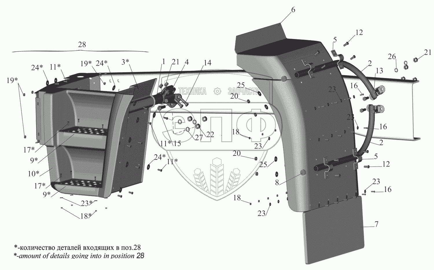Каталог запасных частей к технике: МАЗ-630333. Установка брызговиков передних колес