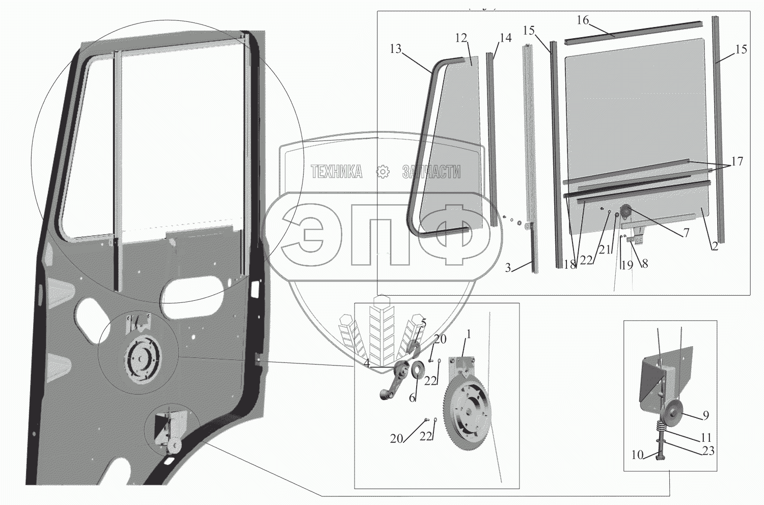 Каталог запасных частей к технике: МАЗ-630333. Установка стеклоподъемника и ручки