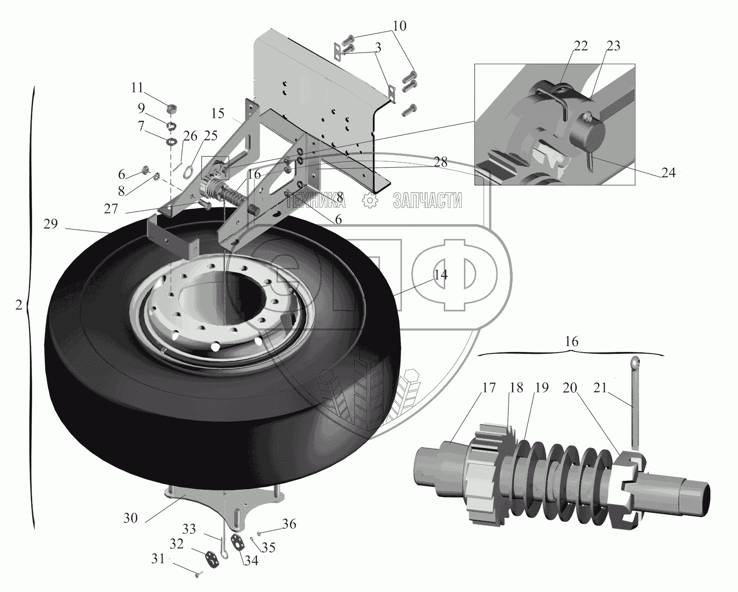 Каталог запасных частей к технике: МАЗ-630333. Установка запасного колеса